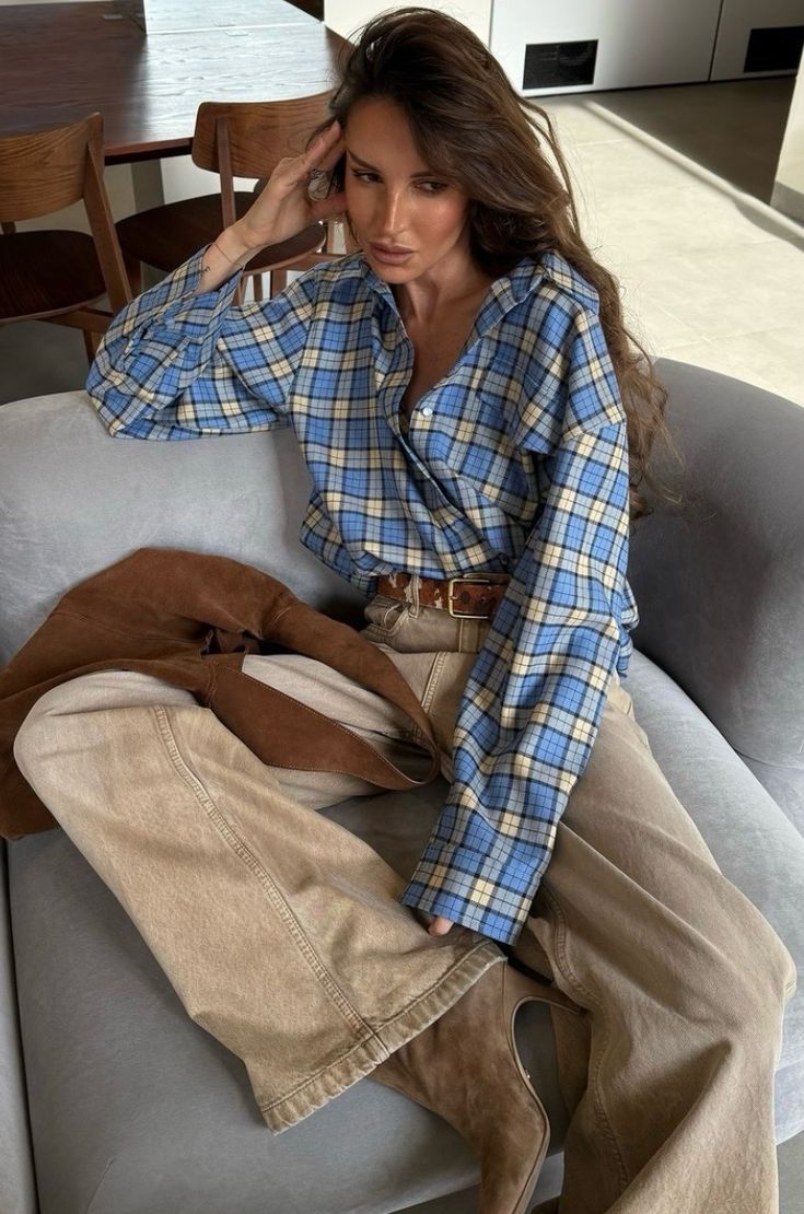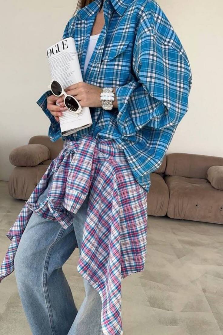 Забудьте, что рубашку нужно заправлять. В 2026 главный тренд — слоистость и намеренная небрежность. Наденьте вашу клетчатую рубашку распахнутой поверх простого платья-миди, тонкого водолазного платья или даже комбинации юбки и топа. Она сыграет роль легкого пальто-кимоно, добавив образу текстуры, объема и динамики.